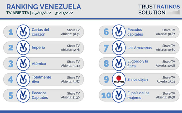 /uploads/set_resources_45/6554b6be8c0d829a8bf63ae0c82cf121_link.png"> [PRODU | RANKING : Venezuela top 10 programas TV abierta del 31 de octubre al 6 de noviembre](https://www.produ.com/noticias/ranking-venezuela-top-10-programas-tv-abierta-del-31-de-octubre-al-6-de-noviembre)