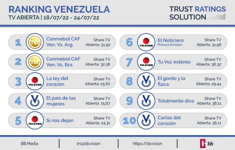 Los ratings (top 10 semanal) de BB Media Venezuela son publicados (al igual que los ratings de Ecuador, de la misma firma) en el sitio web oficial de Produ.
