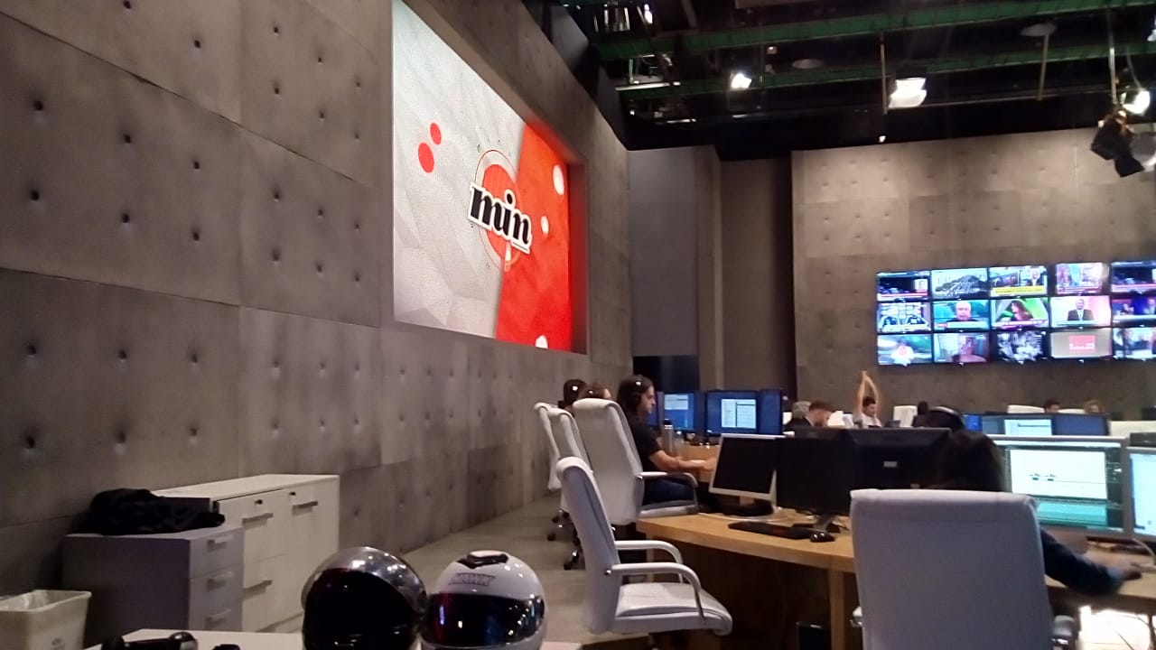 El logo que ven de principio está ubicado hacia la izquierda de la redacción. Está completamente adaptado a su acústica, con las "placas" que simulan ser concreto..