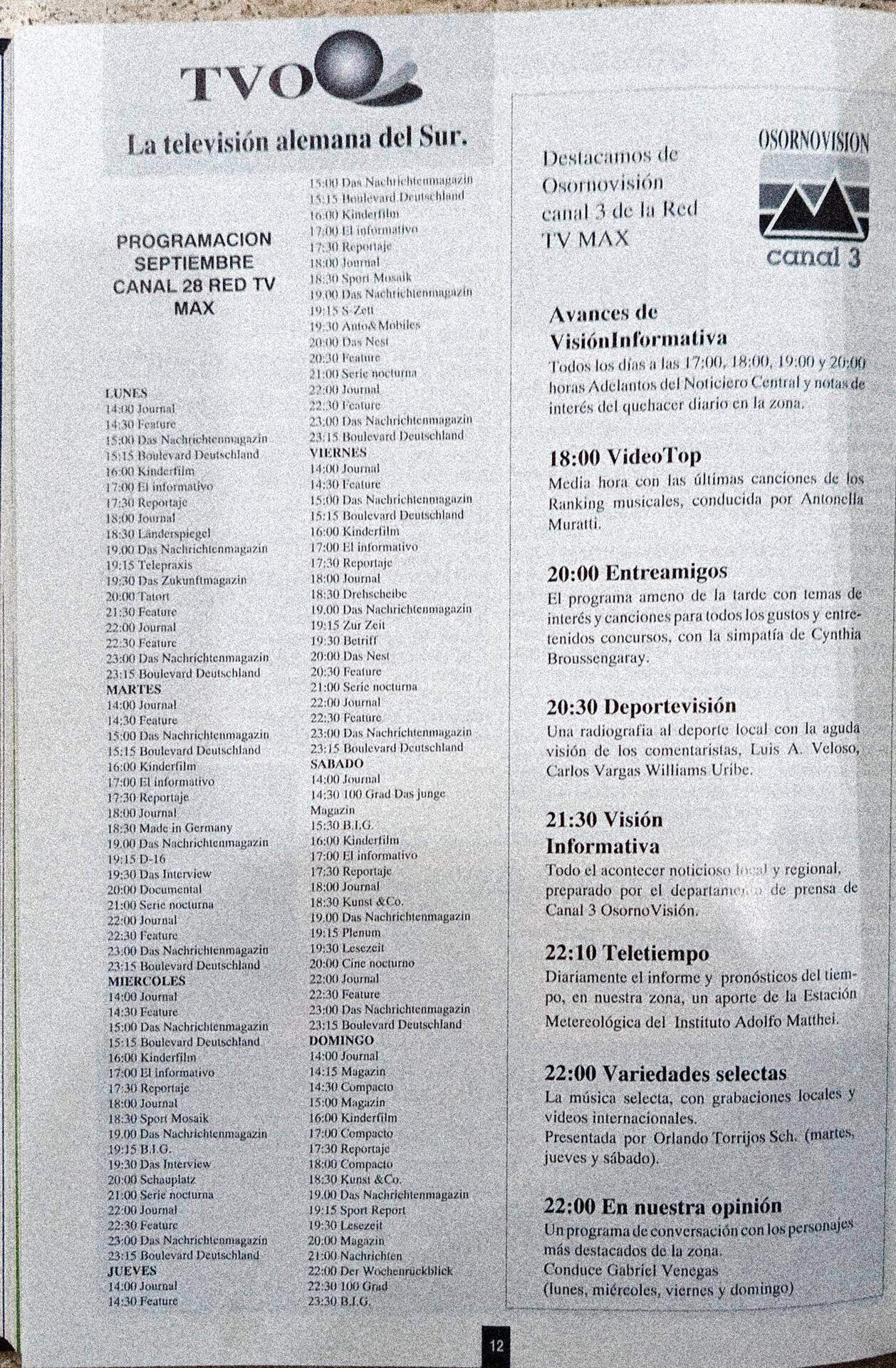 El 1/8/2025 a las 22:05, Tío Sopaipilla dijo:Lo más curioso es que en un inicio (aprox. 1995), TVO era un “canal alemán”. Que hasta compartia programación con DW. Cosa que el formato de “canal alemán” no le sirvió para nada.