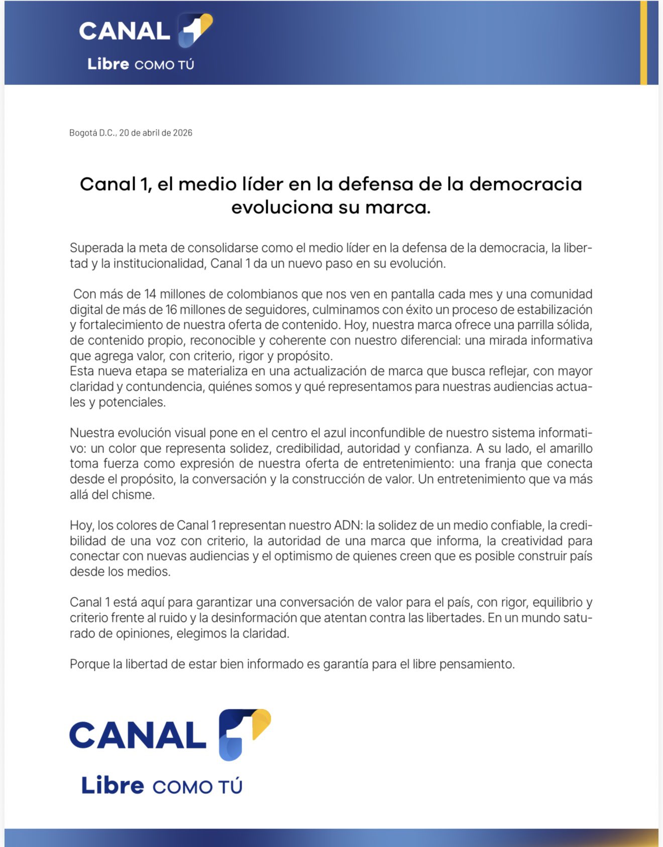 Atención: Luego de una finalización del Grupo Prisa Media hace 1 año y 2 meses al aire Canal 1 con los programas en vivo de las emisoras de Caracol Radio, W Radio, Los 40 y Tropicana en su eslogan Mas Compañia 6 AM, Como Amanecio, Impresentables TV, Entre Valientes, Mujeres W, Tardes 1, Tendencia Total y La Polemica ambos finalizan el primer semestre del año 2025 por su parte el 19 de diciembre de 2025 finalizarón El Pulso del Futbol, La Luciernaga y W Sin Carreta ahora con el regreso de nuestro escogan Libre Como Tu vamos a publicar la programación para el Lunes 22 de Diciembre estaremos muy pedientes