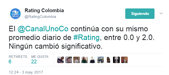 Siendo objetivos, ese tweet de Rating Colombia fue publicado al mediodía del 3 de mayo, es decir, que solo tiene encuenta las mediciones de únicamente dos días (uno feriado y uno hábil) de la nueva programación de transición del Canal Uno. Sin campaña de expectativa y tomando encuenta que esta es una programación de transición mientras se da el lanzamiento oficial, no hay que esperar curvas exponenciales en cuanto a ratings se refiere (al menos de momento)