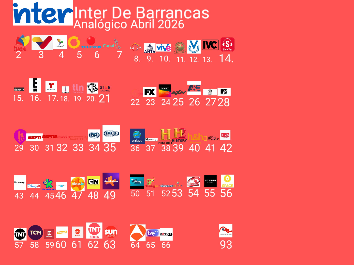 Creo que esto es más ficticio que verdadero, logos desactualizados y diseño en Paint aparte, HispanTV sólo esta en TVGO/Satelital y así varios canales (History 2, Disney Jr, Nick Jr, Baby TV, Tooncast) que solo están en Digital/Fibra/TVGO/Satelital y no son usuales en las grillas analogas que todavía existen (salvo De Película que sí esta en algunas ciudades), Fox Sports ya no existe legalmente en Venezuela a menos que tomasen vía IPTV/pirata las señales de México o Argentina, lo mismo TNT Novelas que todavía (ojalá la nueva administración de CONATEL y/o lo que quede de WBD se acordasen) no esta liberado legalmente para estar disponible en las cableras venezolanas. Y Babyfirst ni siquiera está en nínguna de las grillas oficiales.