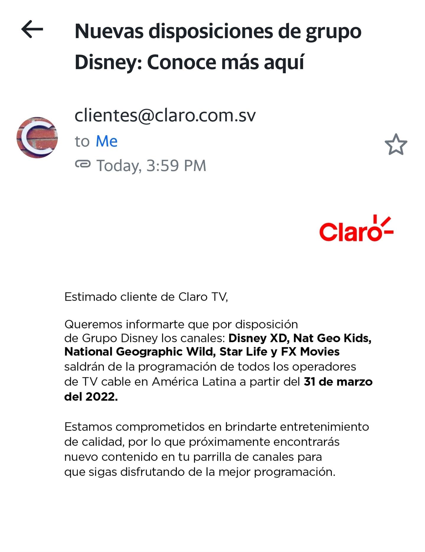 buenas informar que Claro ya notificó la salida de los canales de Disney, pero ofrece sustituirlos, hay que ver que tipo de canales seran esas sustituciones