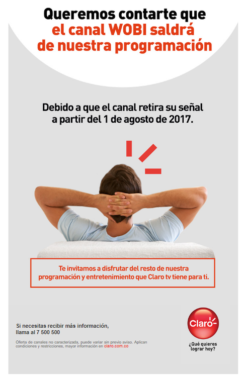 El dia martes me llego correo por parte de claro y el canal WOBI sale de la parrilla de claro en el mes de agosto.
