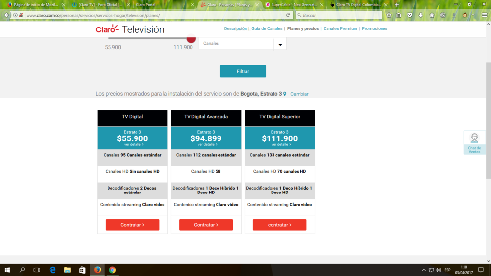 Sería un incumplimiento bajar la cantidad de canales en SD para pasarlos a Superior. Cuando me acerque a un CAV que me aclaren el asunto en estos días, porque pagando unos COP$140.000 aprox. (con Clarovideo incluido, unos US$ 48,87) es un robo teniendo en cuenta las fallas que ha tenido el servicio de internet y el teléfono totalmente muerto. Eso sí, me toca desconectar y volver a conectar para solucionar el percance,