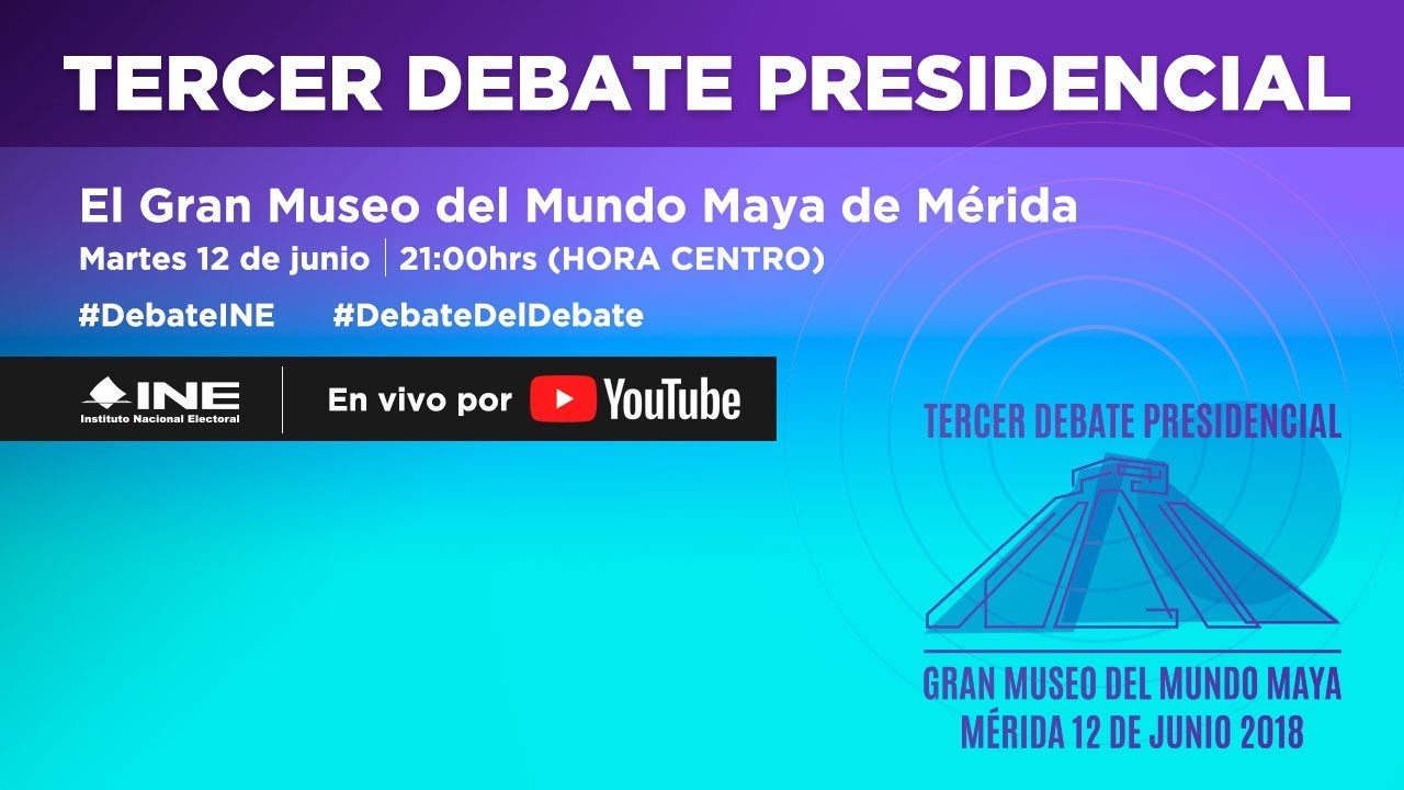 El Martes 12 de Junio, se efectuó el Tercer Debate entre los Candidatos a Presidente de los Estados Unidos Mexicanos para el período 2018-2024 organizado por el Instituto Nacional Electoral y realizado en El Gran Museo del Mundo Maya de Mérida, Yucatán, dando inicio a las 21:00 horas (Tiempo del Centro).