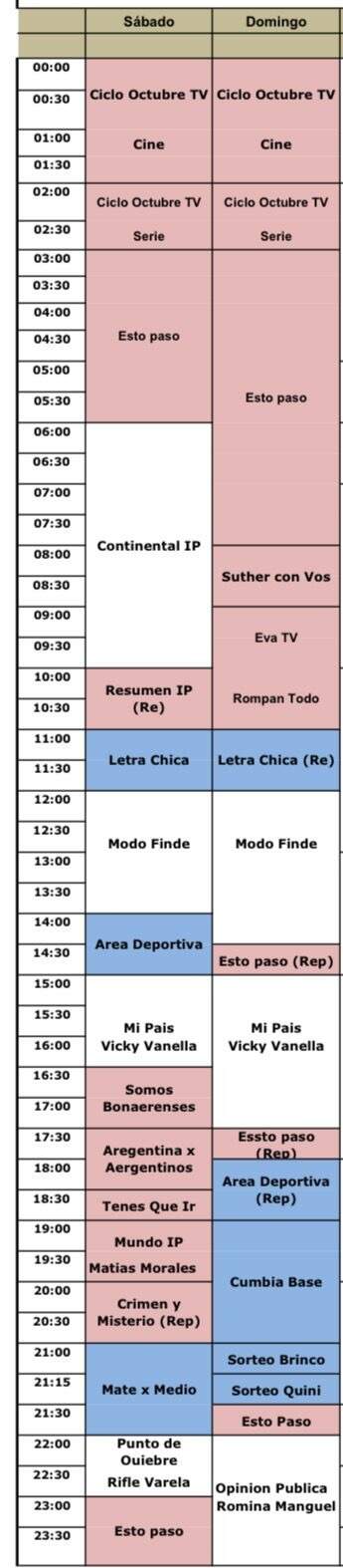 Realmente una pena que sacaran Reprograma-T y la Trasnoche Paranormal… También veo que ahora tienen dos programas pagados por el GBA (Eva TV y Somos Bonaerenses) y maratones de Esto Pasó y Octubre TV para tapar los infomerciales y programas que había en esos horarios antes.