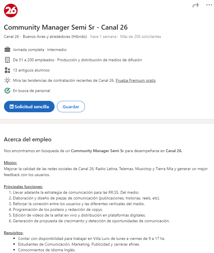 Después de muchos años, Canal 26 lanza una búsqueda laboral formal, en este caso para ocupar el puesto de Community Manager Semi Sr. En esta área trabaja Mauro Calvagna. Como menciona que la zona de trabajo es Villa Luro, está claro que trabajarán desde las oficinas de Escalada 17.
