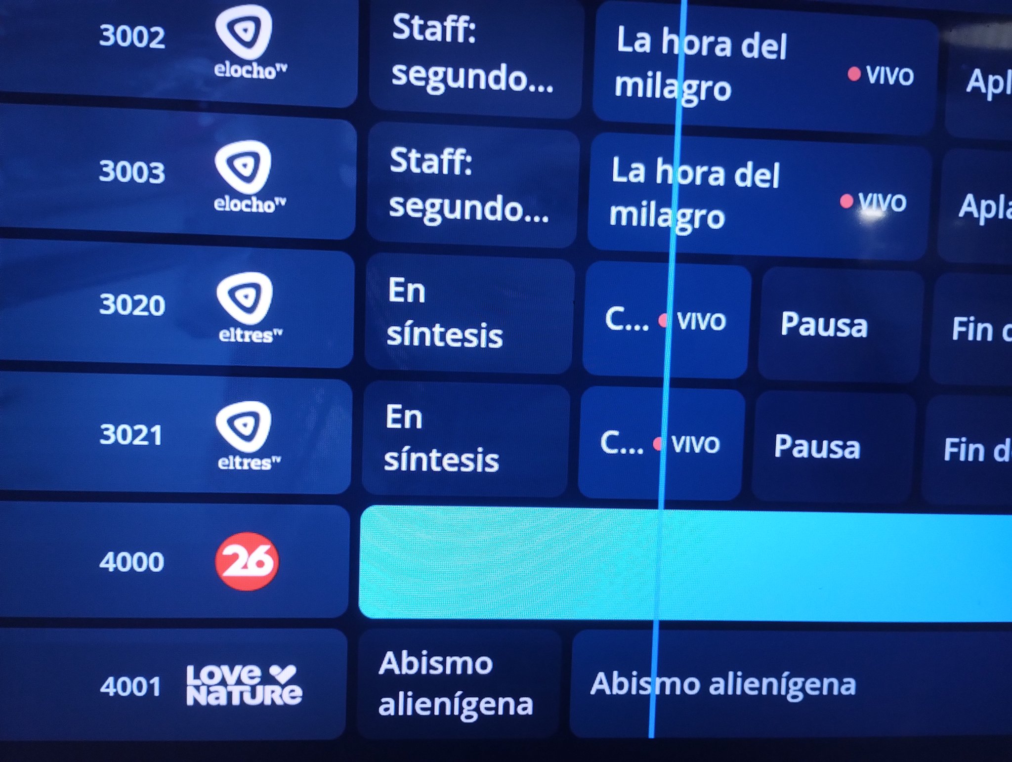 Canal 26 está tan desesperado por lanzar el feed 4K que desde las 23:17 están teniendo problemas con las gráficas. Ahora mismo está sin LEP y con la hora y temperatura en miniatura en medio de la pantalla.