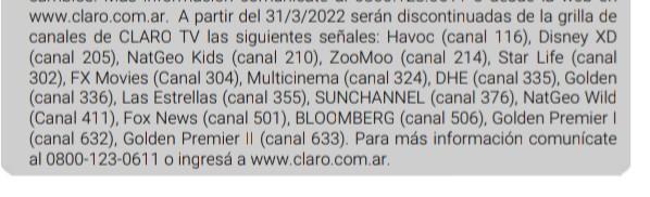Muy malas noticias… Claro paso de ser uno de los mejores cables cuando comenzo a reducirse a casi nada… No solo sacan los canales de Disney sino que se van unos cuantos mas a partir de Abril, una verguenza lo que estan haciendo.