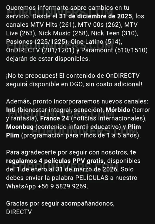 DIRECTV anunció que retirará a partir del 31 de diciembre las señales de Paramount Global (MTV Hits, MTV 00S, MTV Live, TeenNick, Paramount Network y NickMusic), además de Pasiones, Cine Latino y su canal propio, ONDIRECTV. Aunque dicha información de la imagen corresponde a la filial chilena
