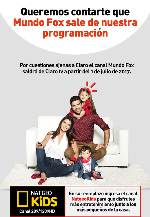 Y como es costumbre, Claro no anuncia salidas de aire de canales para dar paso a uno o varios. Estamos seguros que NatGeo Kids ingresará (también en HD) pero todo se sabrá el sábado por la mañana. ¿Se habrán enterado? Pronostico que sería en el 212 o 214 (1212 o 1214). Obviamente el 404 que correspondía a MundoFox quedará vacío debido a cierre de transmisiones.