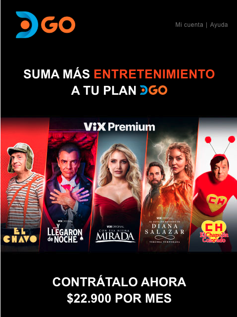 Siguen las novedades en DGO, pues ViX, la plataforma de contenidos número 1 en español del mundo, se suma al portafolio de servicios ofrecidos por la OTT de DIRECTV. Su plan premium ahora se ofrece con costo adicional por el valor de $22.000 con acceso a todo el contenido VOD y señales lineales en vivo de TelevisaUnivision. No se sabe si canales como Las Estrellas, Golden, Univisión, Telehit, Bit Me u otros aparecen dentro de la EPG de DGO tras la activación del plan como regularmente sucede con otros planes como HBO o Universal+, por ejemplo.