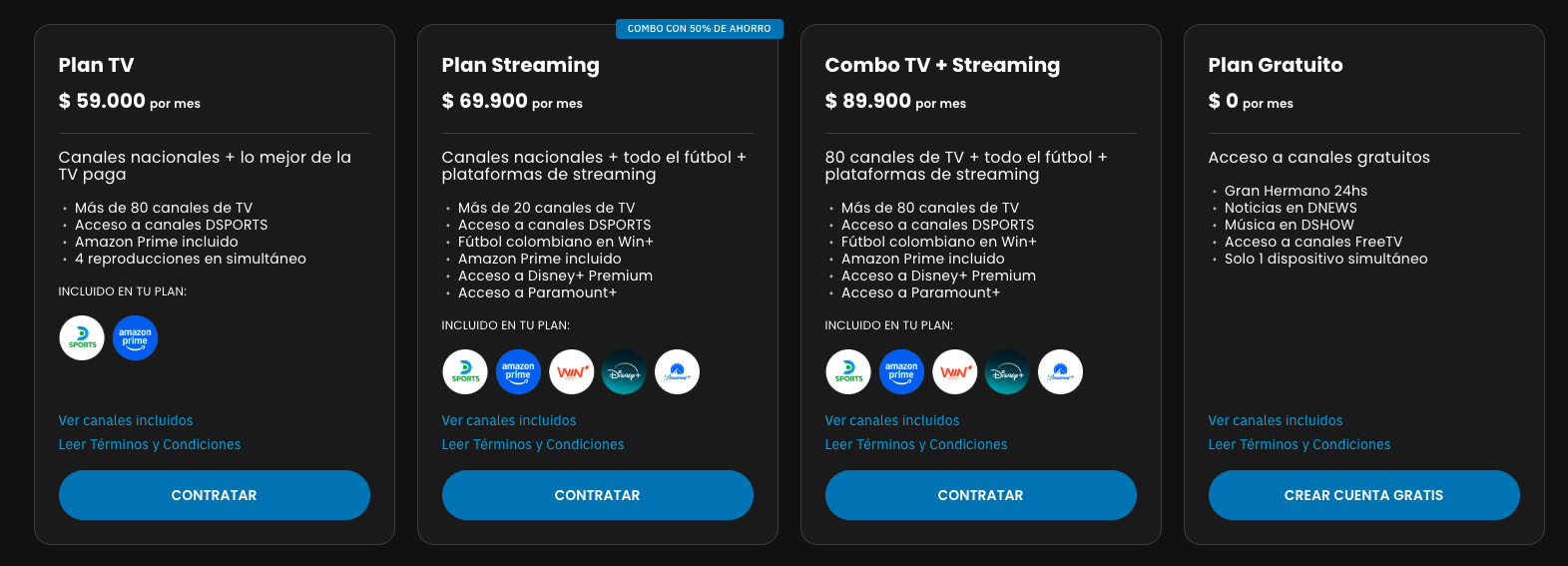 DIRECTV Móvil tiene disponibles tres tipos de planes que ofrecen llamadas con minutos nacionales ilimitados y SMS nacionales ilimitados. El primer plan cuesta COP 39.900 al mes y consta de un paquete de datos de 55 GB, el segundo $59.900 mensuales con 110 GB y el tercero $99.900 con 150 GB.