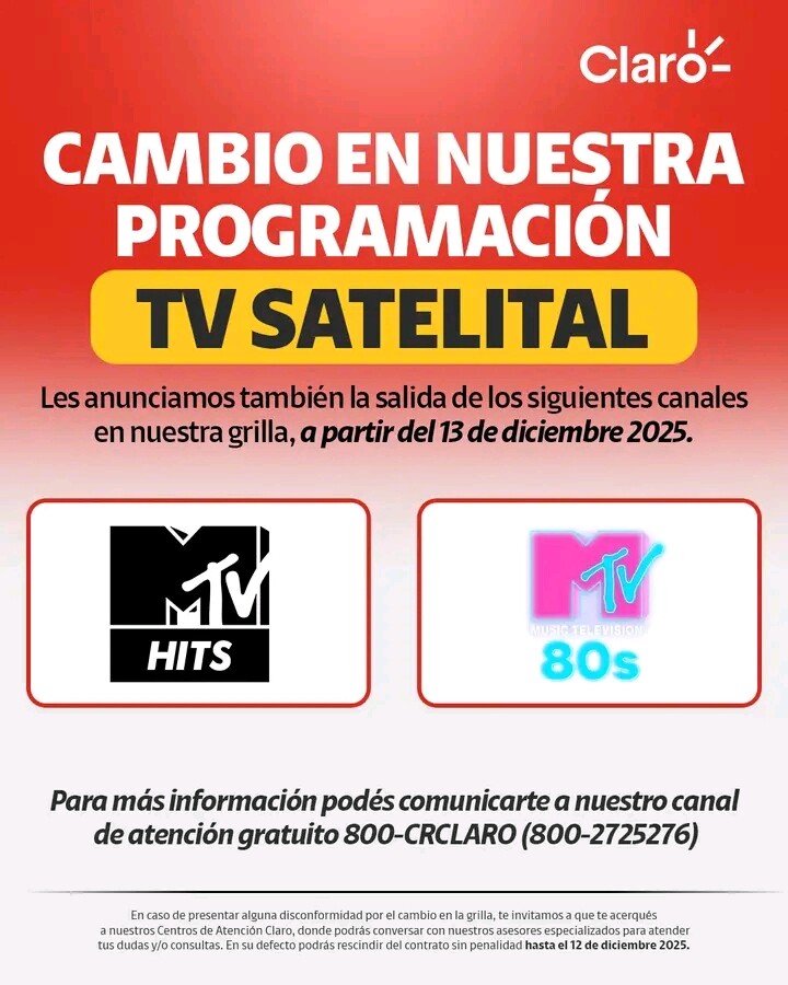 Me autorrespondo, pero no es todo, el operador rojo también sacará MTV Hits y MTV 80s de la programación de TV Satelital también para la región centroamericana, desde la mencionada fecha.