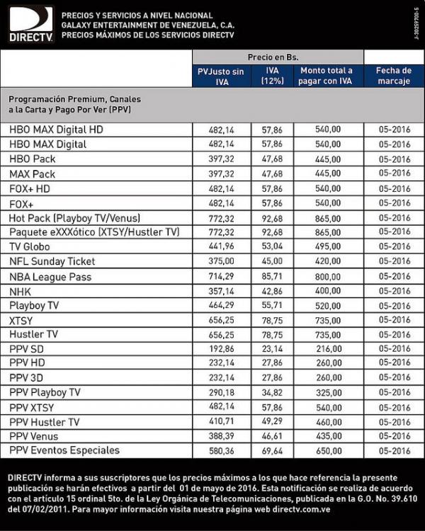 Los precios son oficiales y están en la página de Directv (http://www.directv.com.ve/noticias/?link=foot está casi al final de la misma) y fueron publicados en prensa el 07 de abril, los planes si van a mantener el mismo costo por los momentos.