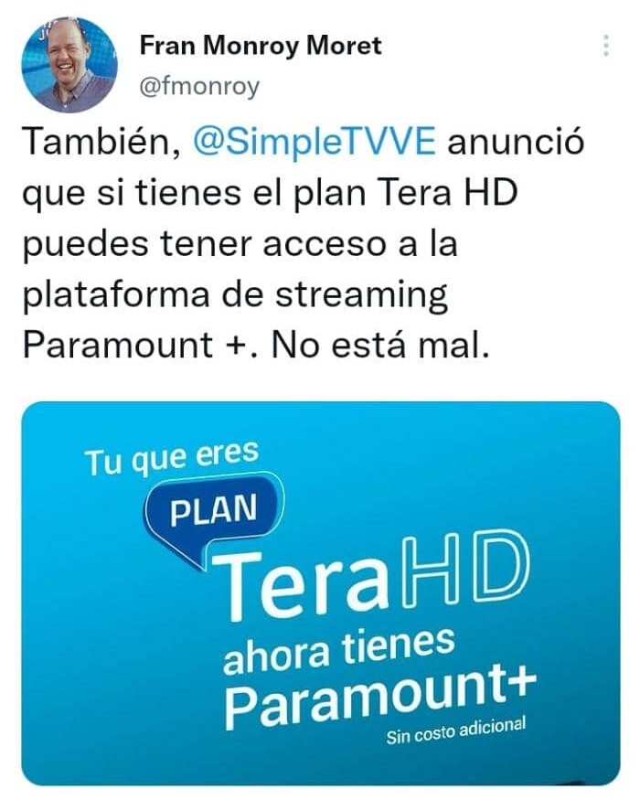 La Empresa Simple TV Acaba de Anunciar Oficialmente Hoy Miércoles 17 de Agosto de 2022 la Activación o Inclusión de la Plataforma de Streaming Paramount Plus Totalmente Gratis a Todos los que Tengan Activo o Contratado el Paquete Tera HD Solamente, y Puedes Disfrutar de Dicha Plataforma Mediante su Aplicación para Celulares, Tablet y su Página Web.