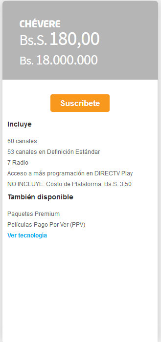 Nuevo plan ‘‘chévere’’ para Previopago y Prepago apareció hoy en la web (es como un Bronce o peor) Por Bs. 180,00 + Bs 3,50 de ‘‘costo de plataforma’’ contiene 53 canales en definición estándar y 7 de radio, mas contenido en DIRECTV Play y opción de añadir paquetes premium o comprar PPV