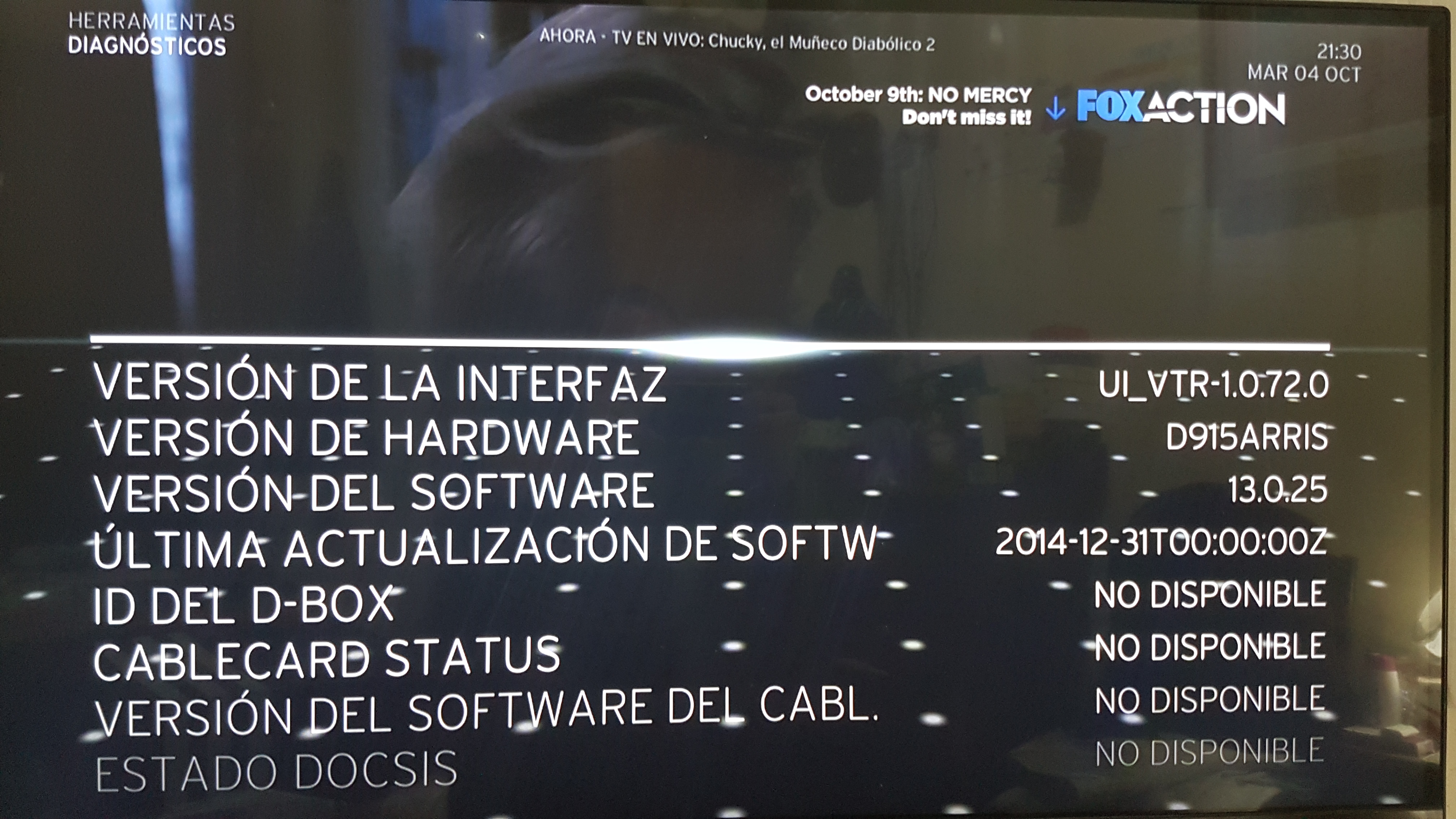 Se han detectado recientemente equipos Nextgen TV estancados con fecha de actualización de Software "2014-12-31" y el equipo da error en buscar actualizaciones diarias ya que estos equipos buscan definiciones casi diaria para mantener al dia las definiciones y VTR no puede solucionar el problema remotamente siendo derivados a Arris para que puedan solucionar el problema del equipo del cliente.