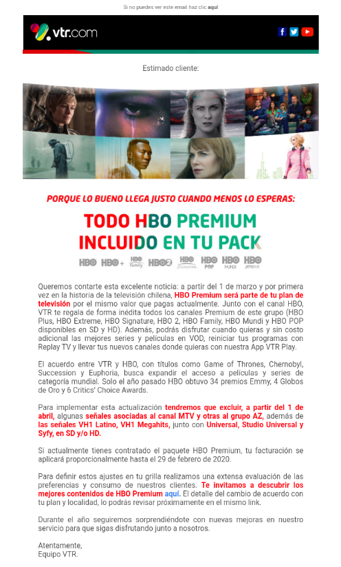 Espero que otro cableoperador haga lo mismo, yo di de baja Vtr por aumento indiscriminado de cobro y tengo otro cableoperador y espero que haga lo mismo que hace Vtr con todo HBO
