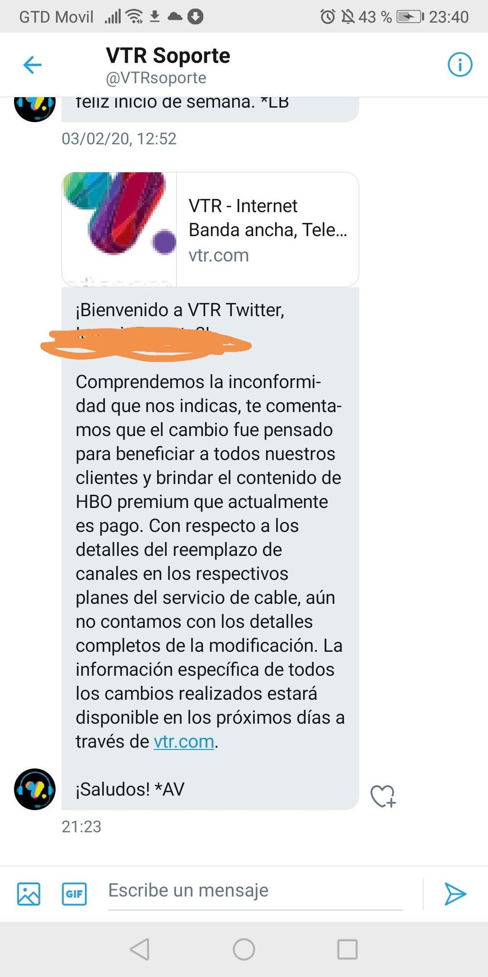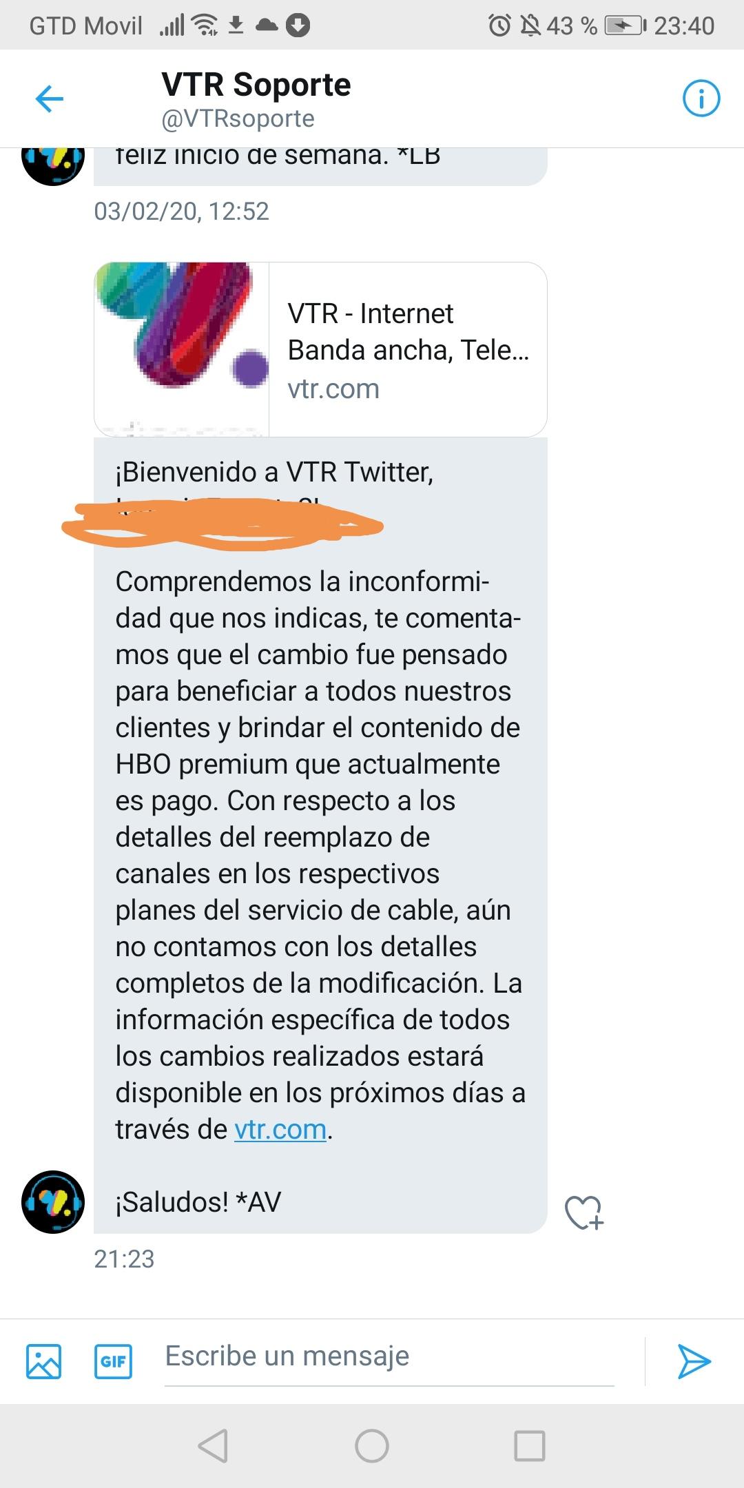En base a lo anterior y los últimos 9 meses de peleas constantes con la compañía por su mal servicio y constantes intermitencias, es que he decidido renunciar a VTR a cobtar del 25 de Febrero.