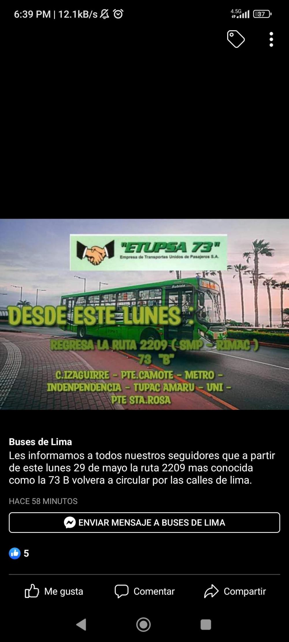 Por otro lado se informa que la 73 B regresa a Lima Norte[](https://cdn.storage.foromedios.com/monthly_2023_05/Screenshot_2023-05-25-18-39-03-151_com.facebook.katana.jpg.b03c33abe196f4fbad68cb027154bbab.jpg)