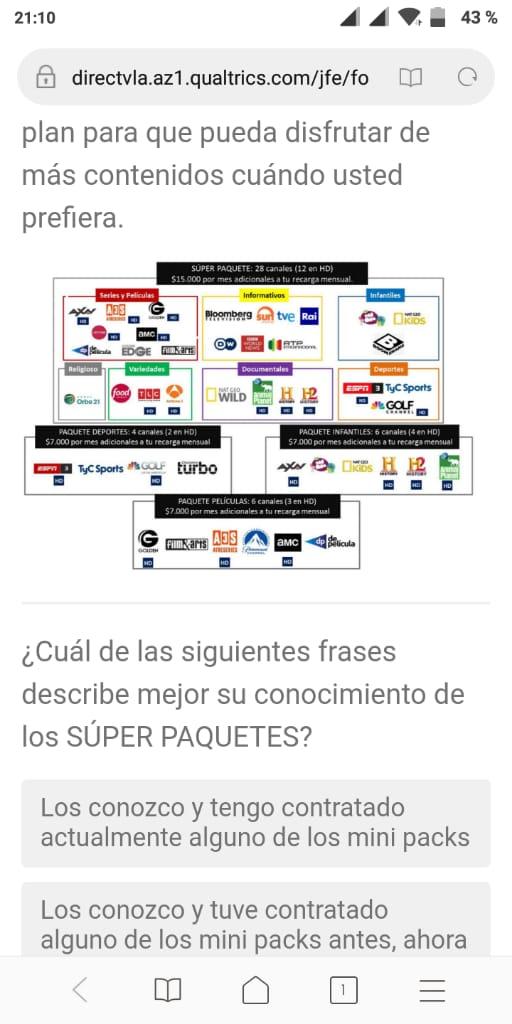 No es una encuesta para poder mejorar el servicio de DirecTV Prepago. Me imagino que en pocos meses se vienen mejoras para ese servicio ya que este año han mejorado bastante a comparación de años anteriores que era bastante limitado en cuanto a canales y paquetes.