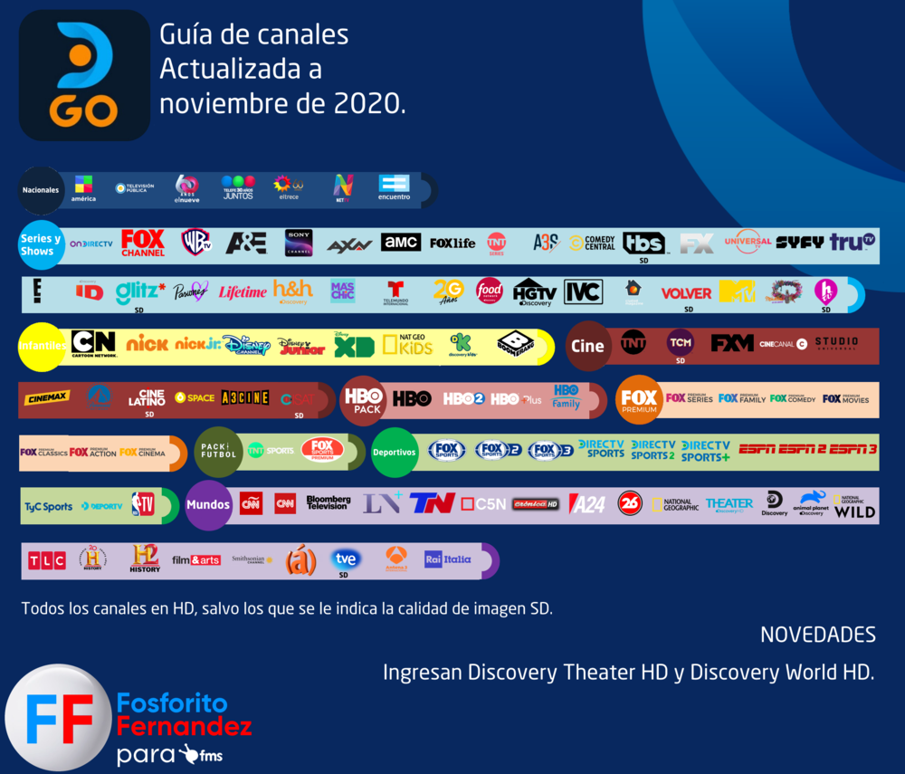 Y novedad, la inclusión de la grilla de DirecTV GO en este post, agradecido a por dejarme hacer la grilla. Y vamos a ver la actualización del mes.. ingresan Discovery World HD y Theater HD, que tengo entendido, por un mes estaran en la plataforma..
