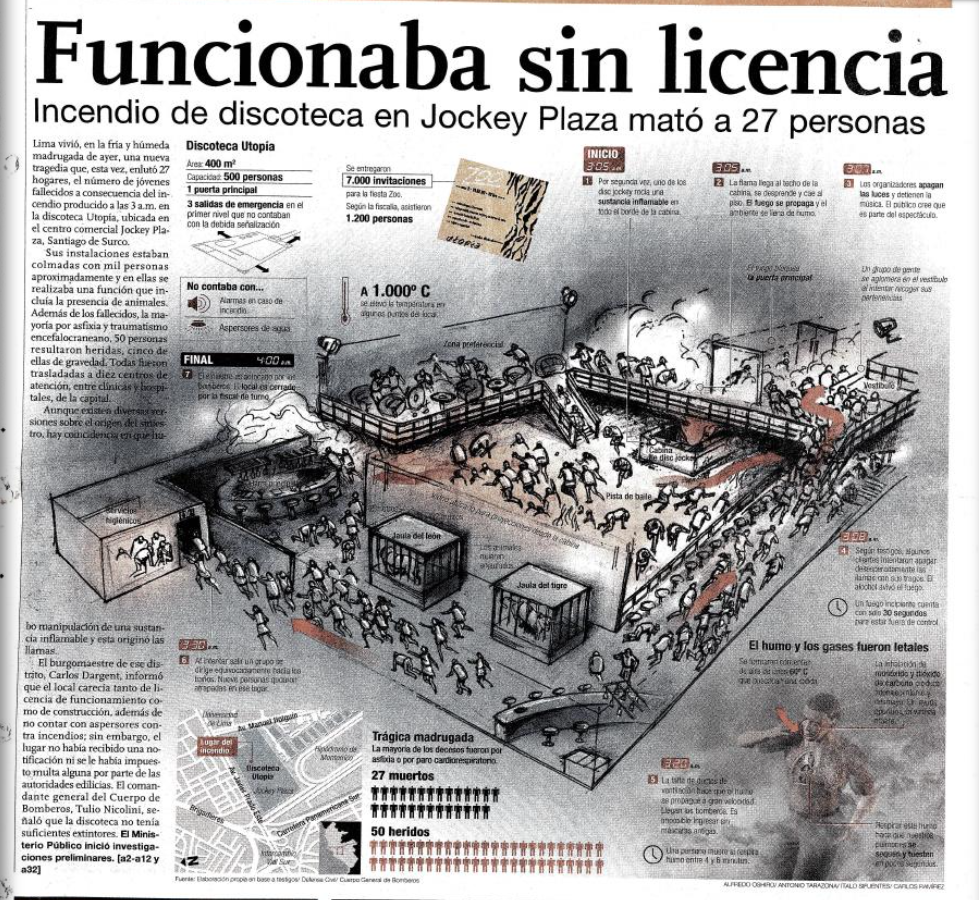 - La entrada estaba en el primer piso, pero la discoteca era subterránea: Los informes oficiales (INDECI) sitúan la entrada en el local 1E-A del primer nivel. Sin embargo, la arquitectura del Jockey no tenía más pisos hacia arriba en esa zona, ya que el techo era el estacionamiento de Santa Isabel (hoy ese estacionamiento tiene un nivel más construído encima). Por lo tanto, mi conclusión es que la discoteca, con sus 2 o 3 niveles (no se ponen de acuerdo en cuántos pisos tenía), se desarrollaba hacia abajo, en uno o varios sótanos. La entrada del primer piso era solo el acceso que luego descendía al local principal.