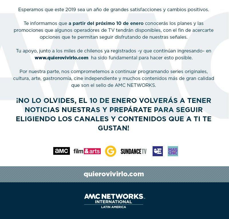 Y después de la salida de los canales de AMC Networks de VTR, para el 10 de Enero ellos tendrán novedades en cuanto a sus canales en el resto de los operadores chilenos.