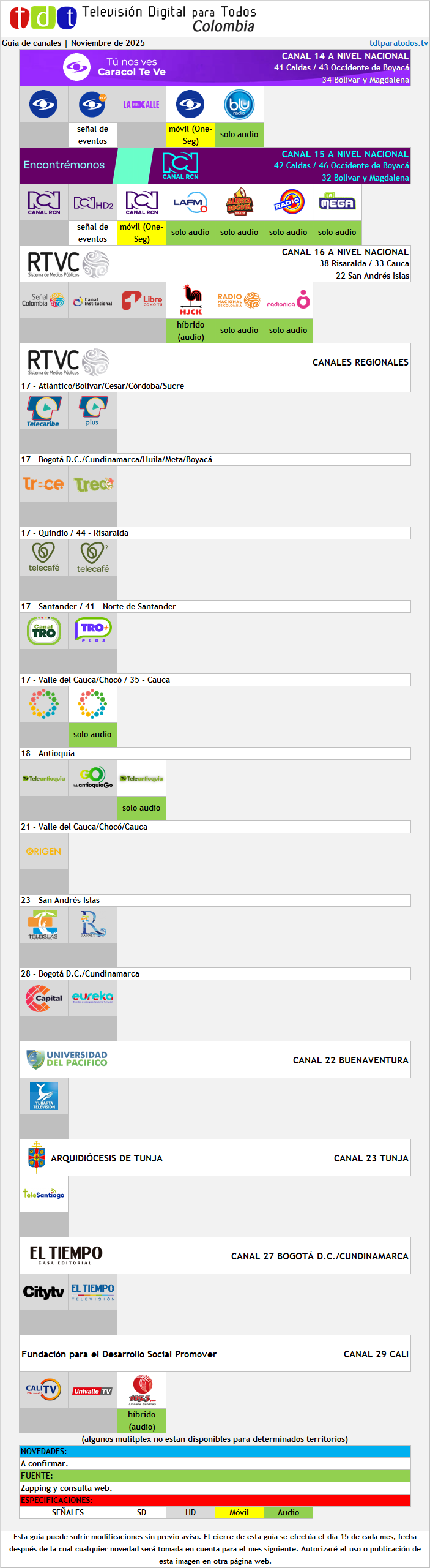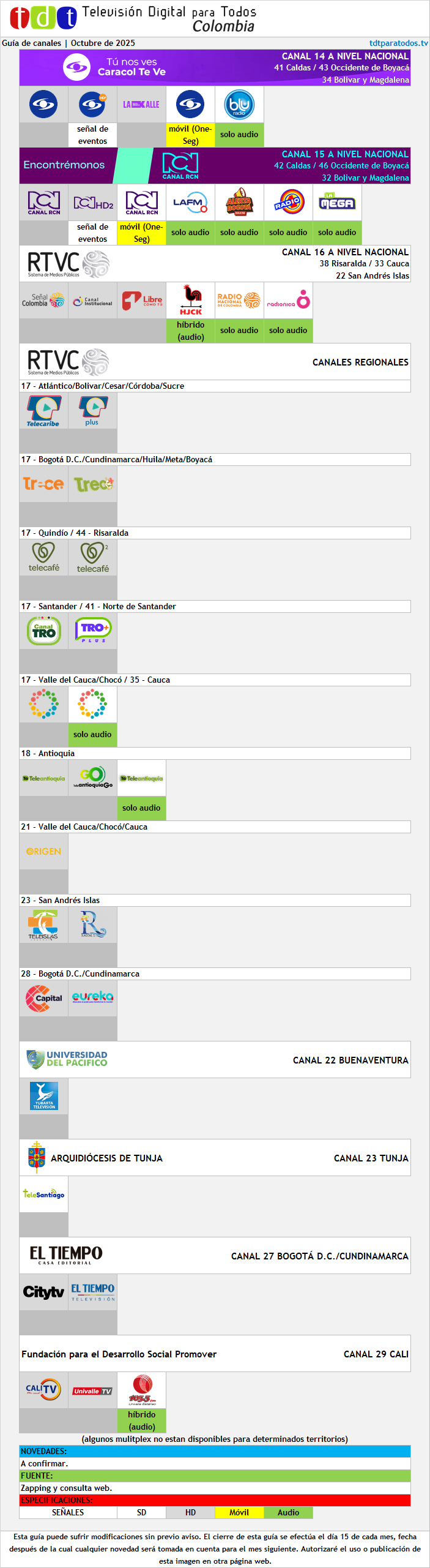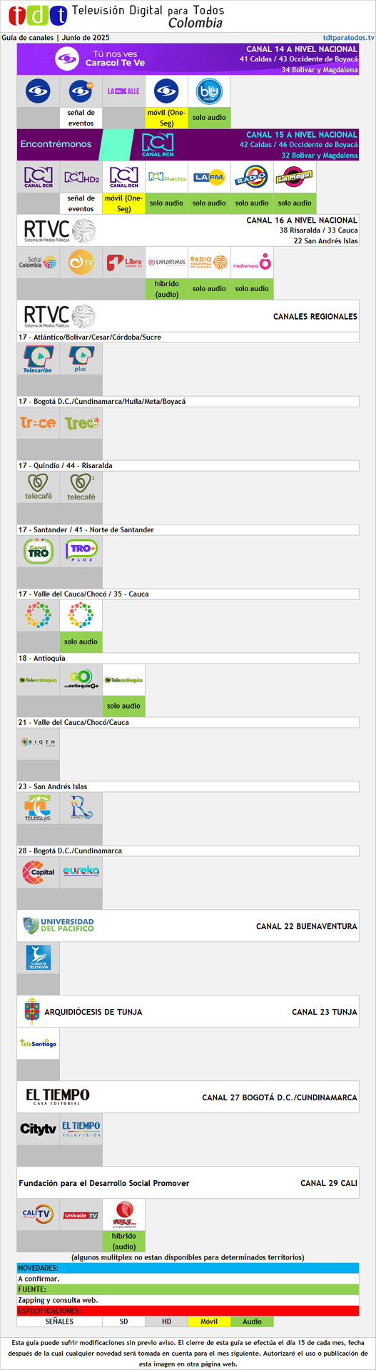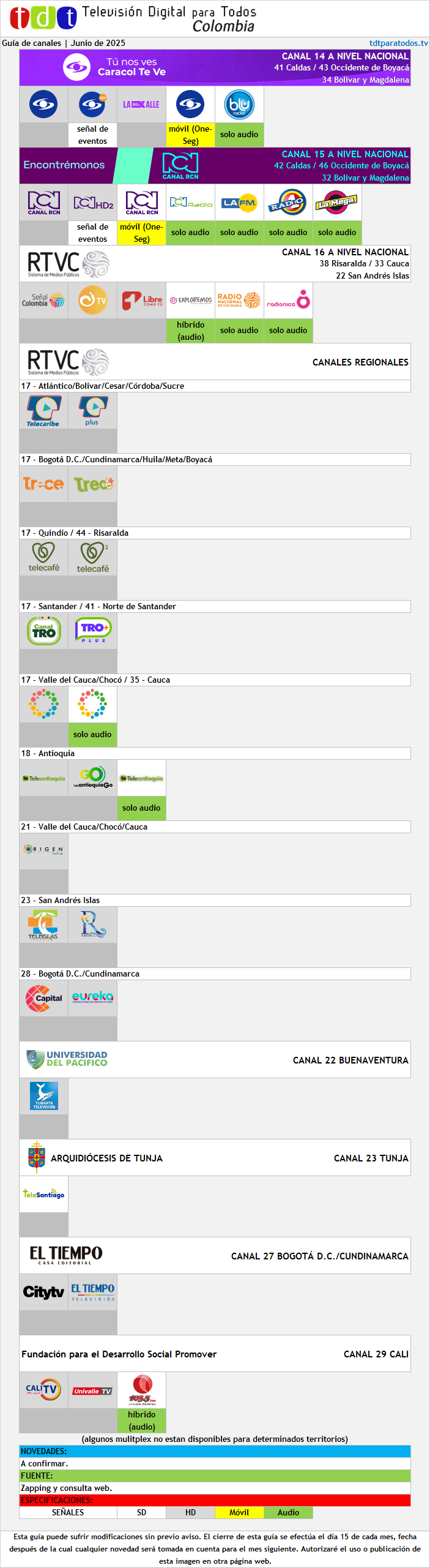 Este mes hubo novedades en la TDT a causa de los movimientos que RCN Radio está haciendo al momento de la publicación (ergo, entre el 1° y el 4 de agosto). La Básica se fue y su lugar lo ocupó La FM en su nuevo formato. El espacio que ésta última ocupaba hasta este mes se lo dieron a Alerta Bogotá (a nivel nacional, imagínense). Ojalá abran dos espacios más para La FM Plus y El Sol (ambas de Bogotá), quedando completa la suite radial de RCN Radio Bogotá a través de TDT.