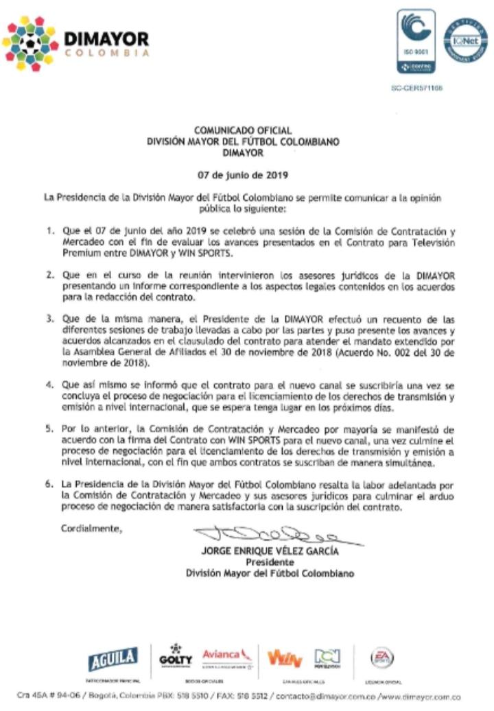 "Se hizo la presentación oficial del Canal Premium, operado por la empresa licenciataria de los derechos de televisión del Fútbol Profesional Colombiano - WIN Sports, que comenzará operaciones en el mes de enero de 2020", indicó el dirigente.