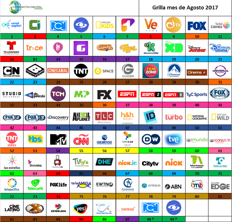 Bueno este mes voy a hacer la publicacion de la grilla de conexion digital del mes de agosto el cual no ha tenido cambios relevantes aparte del logo del canal uno a estrenar este mes en este mes estoy al pendiente de cualquier comentario muchas gracias