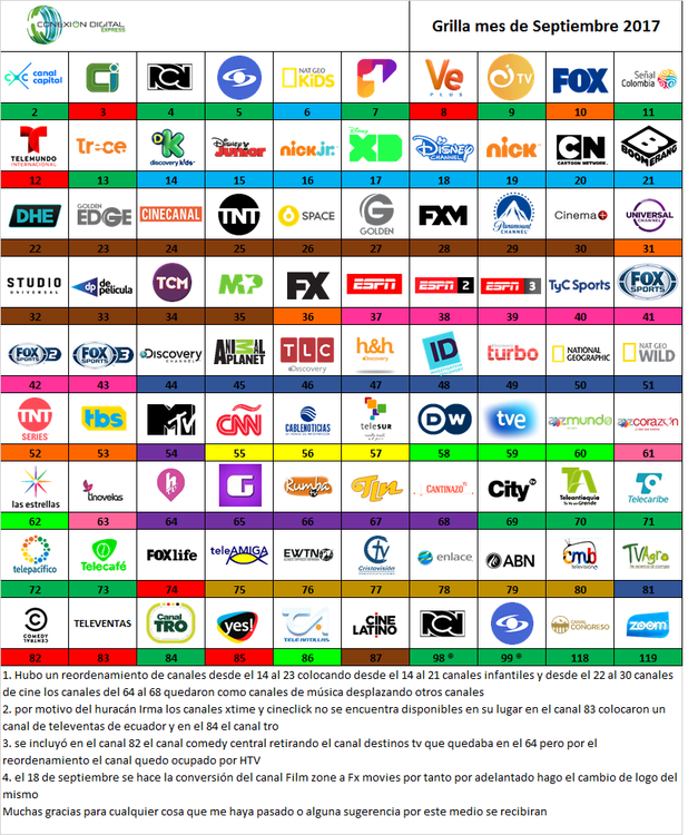 Buenas tardes lo que pasa es que en lo que vi pusieron este topic hace unos dias pero no lo volvi a ver entonces voy a publicar la grilla de septiembre de esta cable operadora ha tenido cambios dese el mes pasado reordenaron las frecuencias musicales, de peliculas e infantil ademas yo adelanto el logo de fx movies