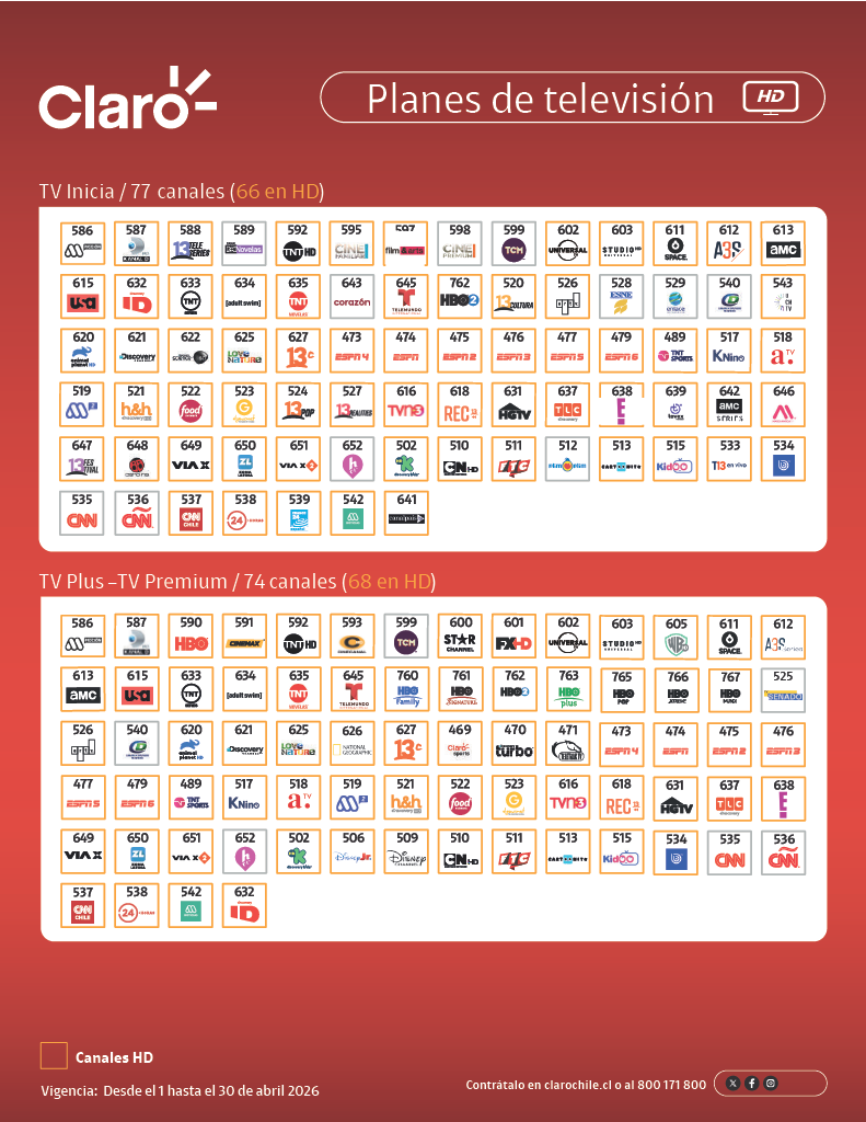 Esta es la lista de canales de Claro Chile, actualizada a abril de 2026. Se puede notar el ingreso de Knino por el canal 517.