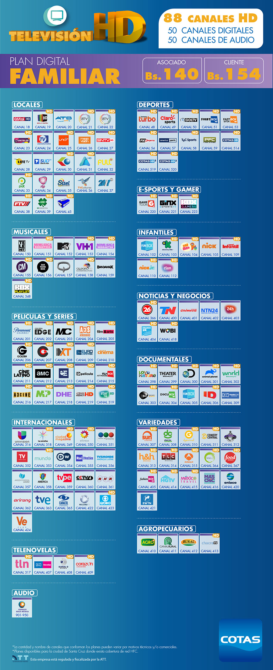 Esta es la grilla actual de la cablera boliviana COTAS, a la última versión. Nótese que no aparecieron los canales de Warner Bros. Discovery (ex WarnerMedia) debido al cese de contratos, aunque los de Discovery todavía están. Tomado de www.cotas.com