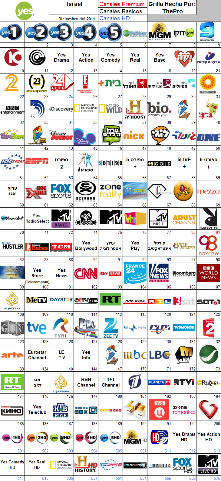 Varios canales de la grilla estan escritos en Hebreo y cuesta saber de que se trata o buscarlos en Google, por eso dejo el link en Wikipedia con las señales del operador: http://en.wikipedia.org/wiki/Yes_(Israel)