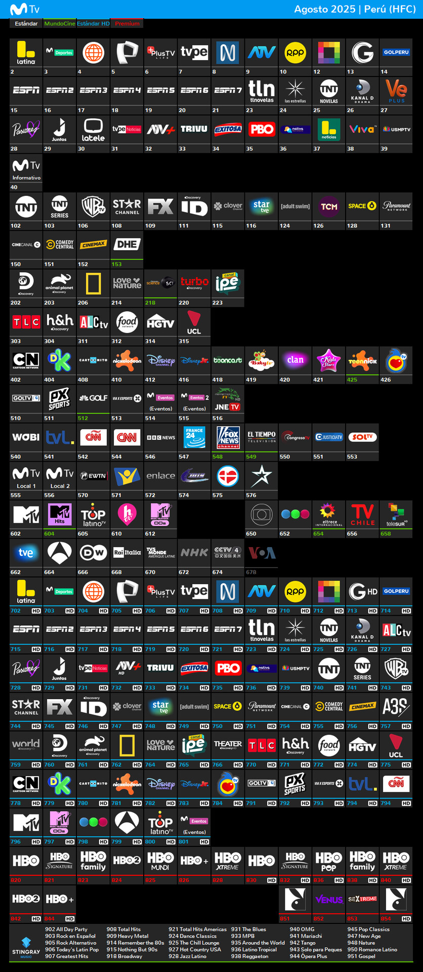 Les dejo la grilla actual de Movistar TV, tal como se ha reportado hasta ahora con las novedades y zappings más recientes publicados, ya que rara vez se publica de esta forma por acá, cualquier detalle u otra novedad pueden reportarla y así hacer las modificaciones. Sé que también está una grilla para el servicio de Fibra (con su información disponible en la web de Movistar Perú) y quizás la haga aparte.