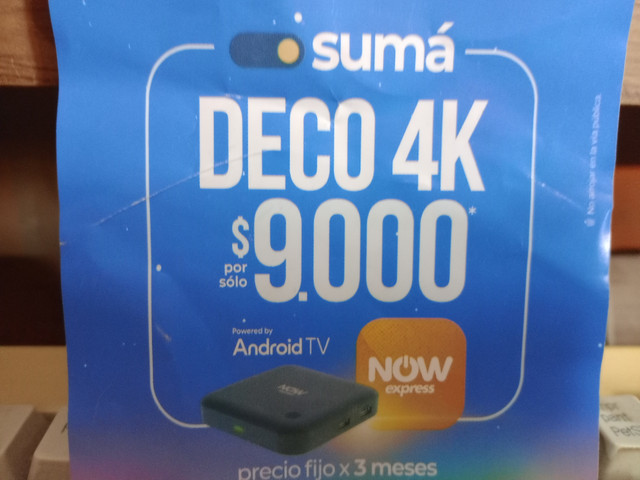 Gracias a Chachoneta, también hay un decodificador 4K disponible. No encontré el modelo pero la foto del volante se ve que tiene dos puertos USB en el costado, una luz led verde y, en la parte de arriba, un botón de encendido en la esquina junto al logo de NOW Express