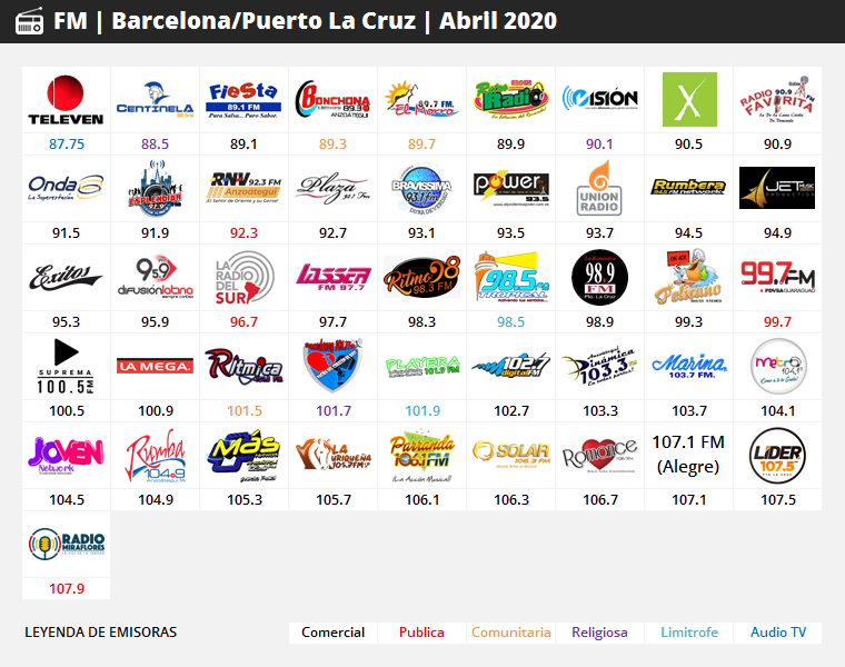 Al momento de redactar este post, se encuentran apagadas temporalmente 97.1 (RNV Activa), 100.1 (Marejada) o 102.3 (VEPACO FM), también apagada desde hace unos días Líder 107.5 (pero incluida en la grilla al estar al aire a principios de mes). Probablemente estas emisoras puedan ser reactivadas en cualquier momento (sea por la contingencia pandémica o por razones técnicas)