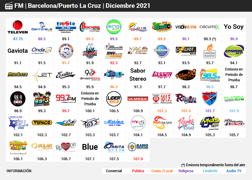 - Se renombra la emisora comunitaria de Puerto La Cruz, Líder (96:3) a Movida. También se ha renombrado recientemente Alegre (107.1) a Blue.