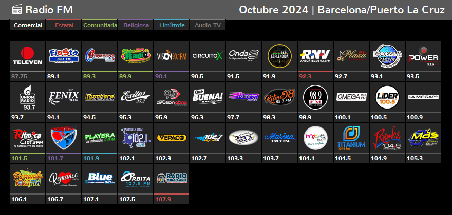 Dentro de unas semanas publicare la grilla repecto a Enero, aunque este mes ya hay novedades, se reactivó el 99.3 FM transmitiendo VN Radio (104.9 FM Caracas), la radio del portal “informativo” (oficialista) “Venezuela News”, además cuenta con RDS, también fueron activados los RDS de RNV Informativa (92.3) y Radio Miraflores (107.9), hasta ahora sólo tenían activados los RDS en la zona Digital 102.7 y Dinámica 103.3. Aparte, la otra frecuencia del Estado, 96.7, volvió a estar activa, hace unas semanas retransmitiendo precisamente RNV Activa pero ahora volvió a conectarse a La Radio del Sur (siempre con cálidad de sonido bajado de internet). Todo esto se reflejará en la grilla de Enero.