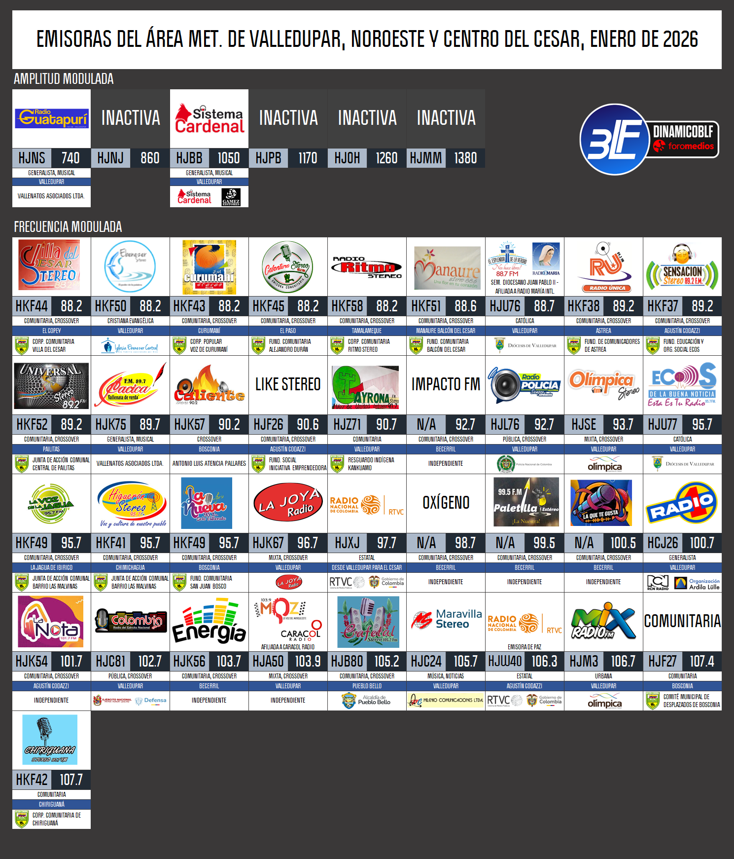 Grillas AM y FM del Norte y Centro del Cesar - Enero de 2026