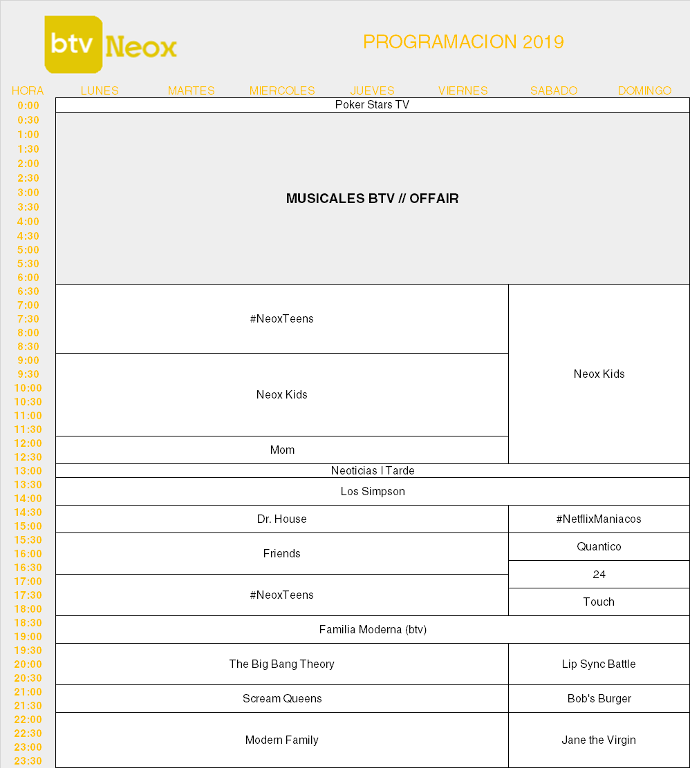 Btv Neox es una adaptación colombiana a lo que es el canal homónimo de Antena 3 en España, este tendrá gran variedad de producciones de nivel internacional, basándonos principalmente en series y shows de telerrealidad, también tendremos un noticiero donde lo principal será el mundo del espectáculo y la tecnología. Neox iniciará transmisiones el Lunes 4 de Febrero a las 2:30PM, con la serie "Dr. House"
