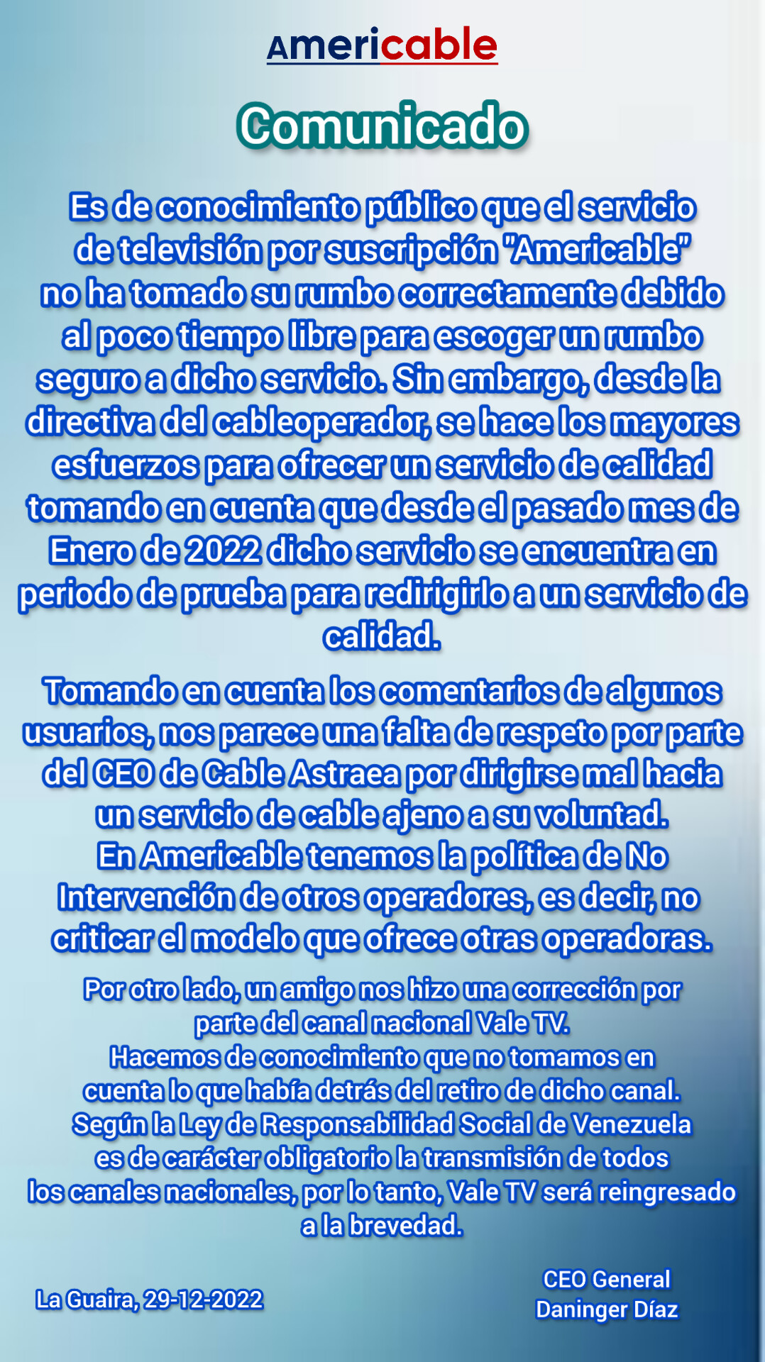 **Lo segundo:** no tengo nada en contra ni me he tomado nada personal con relación a Americable o su CEO. Lo que dije y me sostengo: una grilla de texto es algo altamente descuidado e inadmisible para un producto que debe considerarse de calidad. No he sido grosera en ningún momento.