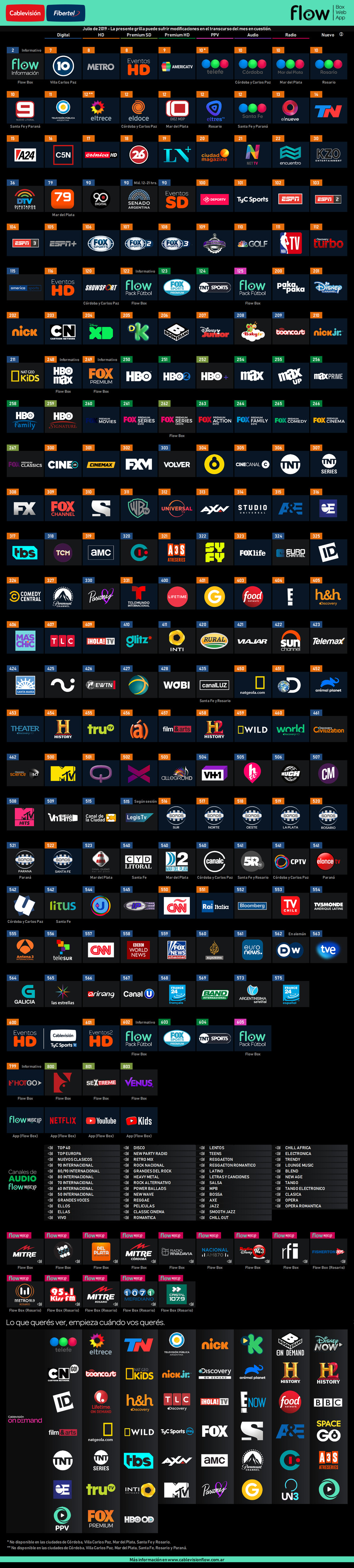 Nota: último mes de INTI Network (411) en las grillas digital, HD y Flow, ya que dejará de ser parte desde el próximo 1° de agosto.