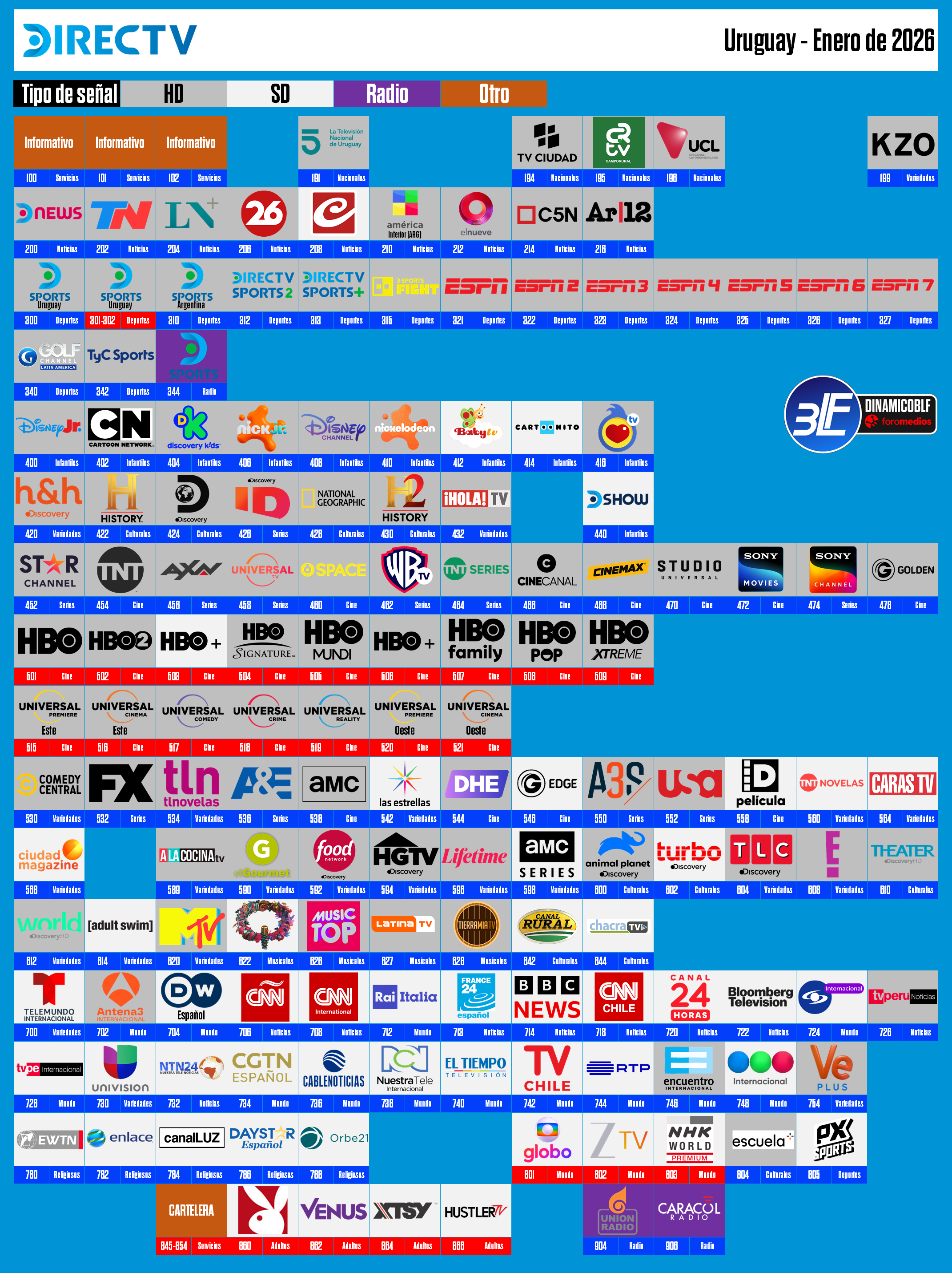 Algien subió un zapping de Enero 2026 de DTV Uruguay y parece que muchos canales aparecen en la numeración uruguaya y también en la numeración latinoamericana, con canales duplicados