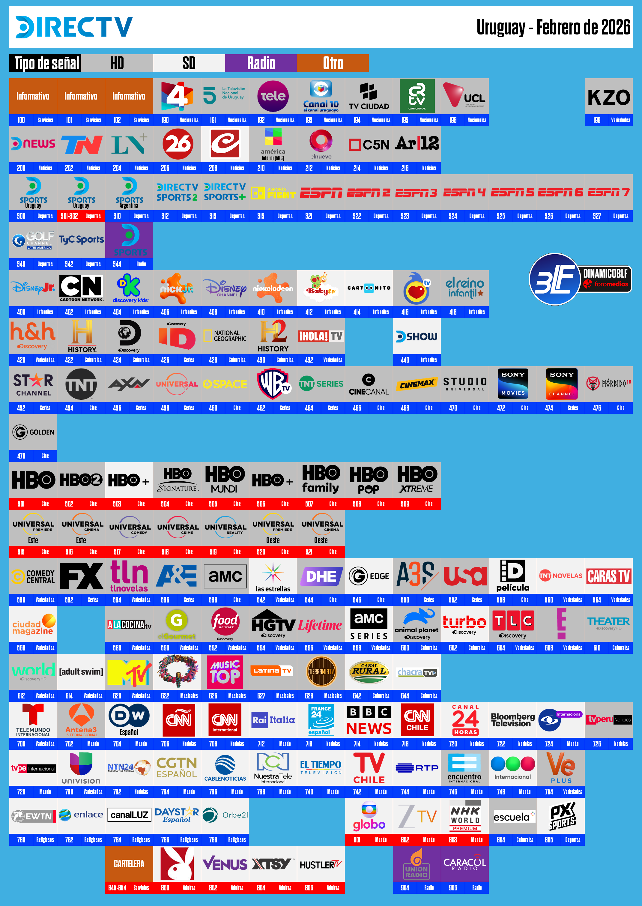 Guía de canales DirecTV, Uruguay, Febrero de 2026