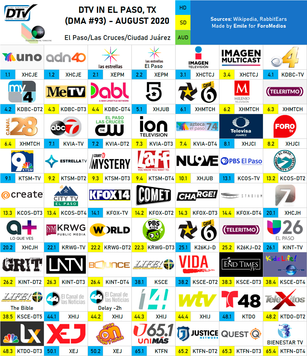Nótese el cruce de canales de los mercados televisivos de El Paso/Las Cruces (en el lado estadounidense) y Ciudad Juárez (en el lado mexicano), dando una interesante mezcla donde coexisten Las Estrellas y Univisión, Azteca Uno y Azteca América, Nu9ve y Telemundo, Canal 5 y ABC, el canal 44 mexicano y PBS, etc. Nu9ve no fue al 9.1 sino al 10.1 para no crear conflicto con KTSM (afiliada de NBC), así como Foro TV fue al 8.2 y no al 4.1 para que no ocurra lo mismo con KDBC (afiliada de CBS). De la misma forma, Azteca 7 tuvo que ir al 20.1 y no al 7.1 porque de lo contrario generaría otro conflicto con KVIA (afiliada de ABC), aunque en este caso debió irse con todos sus subcanales.